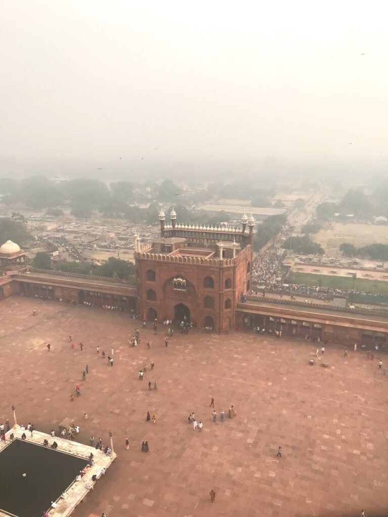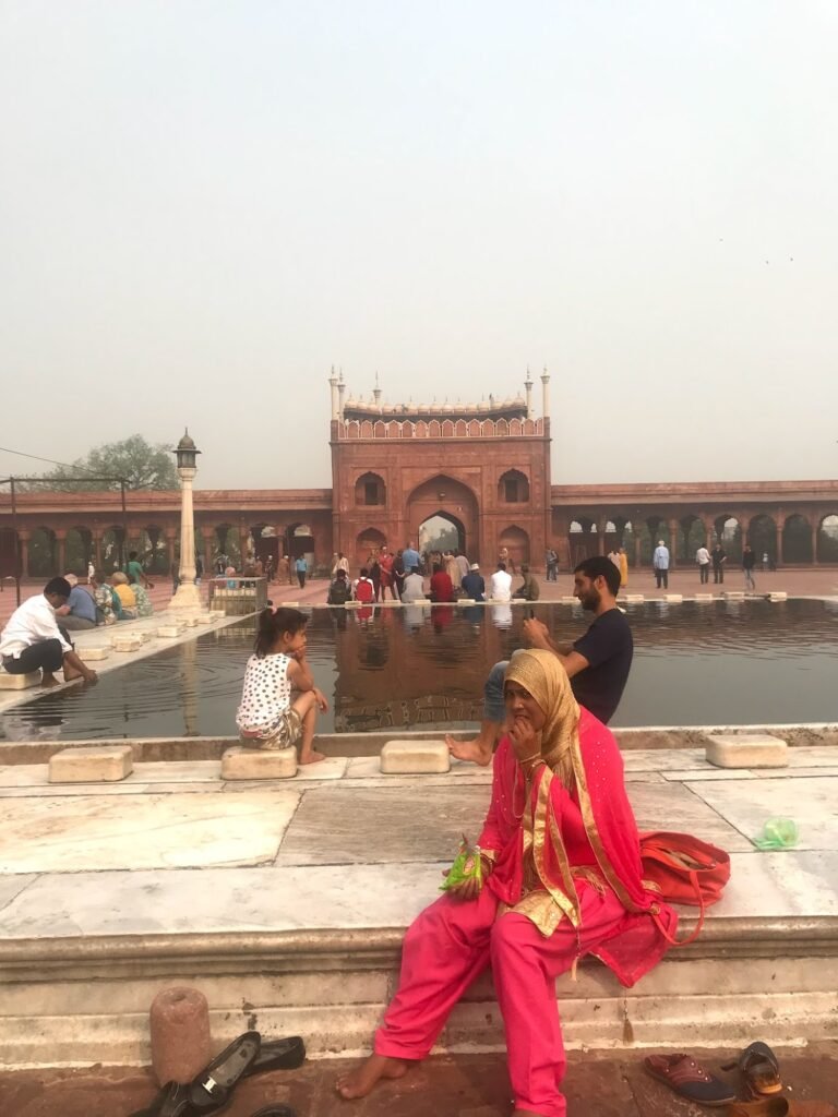 Ahora, lo que viví yo: cuando llegás, tenés que sacarte los zapatos, porque como toda mezquita, se entra descalzo. Caminás por ese suelo caliente (tipo baldosa en verano en Mar del Plata) y empezás a recorrer este espacio inmenso, donde lo primero que te atrapa es el piletón central, un estanque rectangular donde la gente se purifica antes de rezar, o simplemente se sienta a descansar, meditar, charlar o mirar al cielo, que hoy no se veía mucho porque había una neblina tan espesa que parecía cuento… hasta que recordás que no es niebla, es puro smog del bueno, marca registrada Delhi.