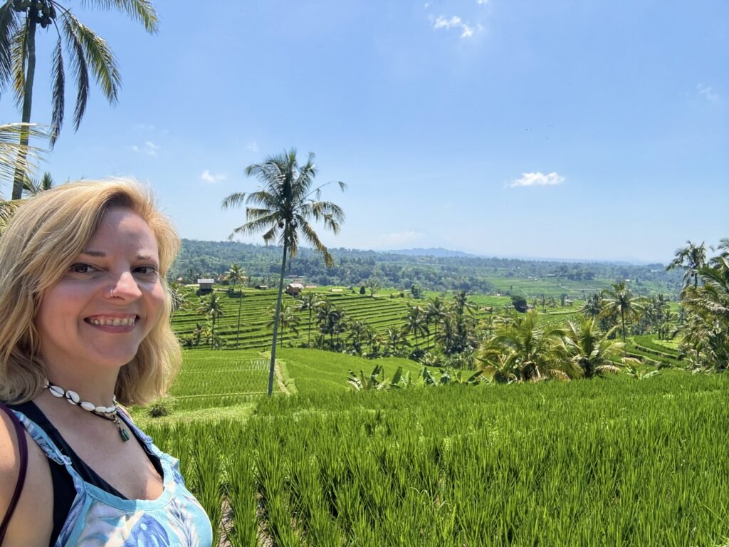 Cuando llegué a Jatiluwih, quedé muda. Yo, que hablo hasta debajo del agua, me quedé callada. Esos arrozales parecen una alfombra verde gigante que alguien desenrolló montaña abajo. Te juro que pensé: “esto no puede ser real, seguro es un fondo de pantalla de Windows”. Pero no, ahí estaba yo, parada, colorada como camarón porque, obvio, me olvidé otra vez el protector solar y el gorro. Siempre la misma, Nadita versión pollo a la parrilla.