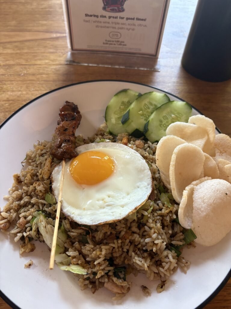 La vuelta a Kuta fue eterna, pero yo venía como flotando, feliz. Para rematar, me fui a cenar y pedí un plato típico: arroz con huevo y pollo. Simple, sí, pero espectacular. Yo que en casa me hago un arroz medio triste, acá me lo sirven y es como si la vida me dijera: “tomá, así se hace, aprendé”.