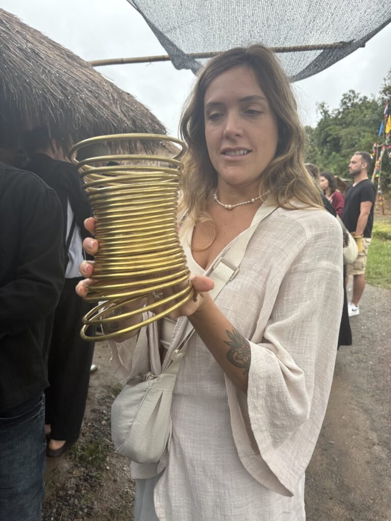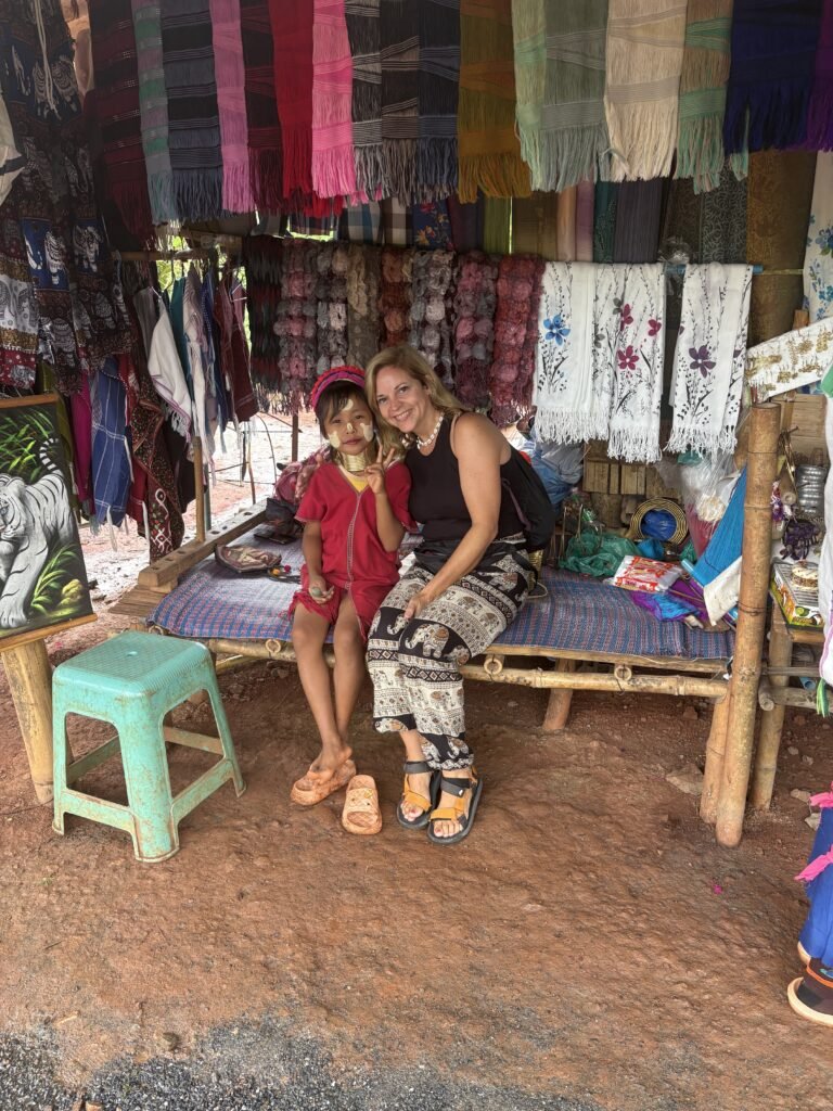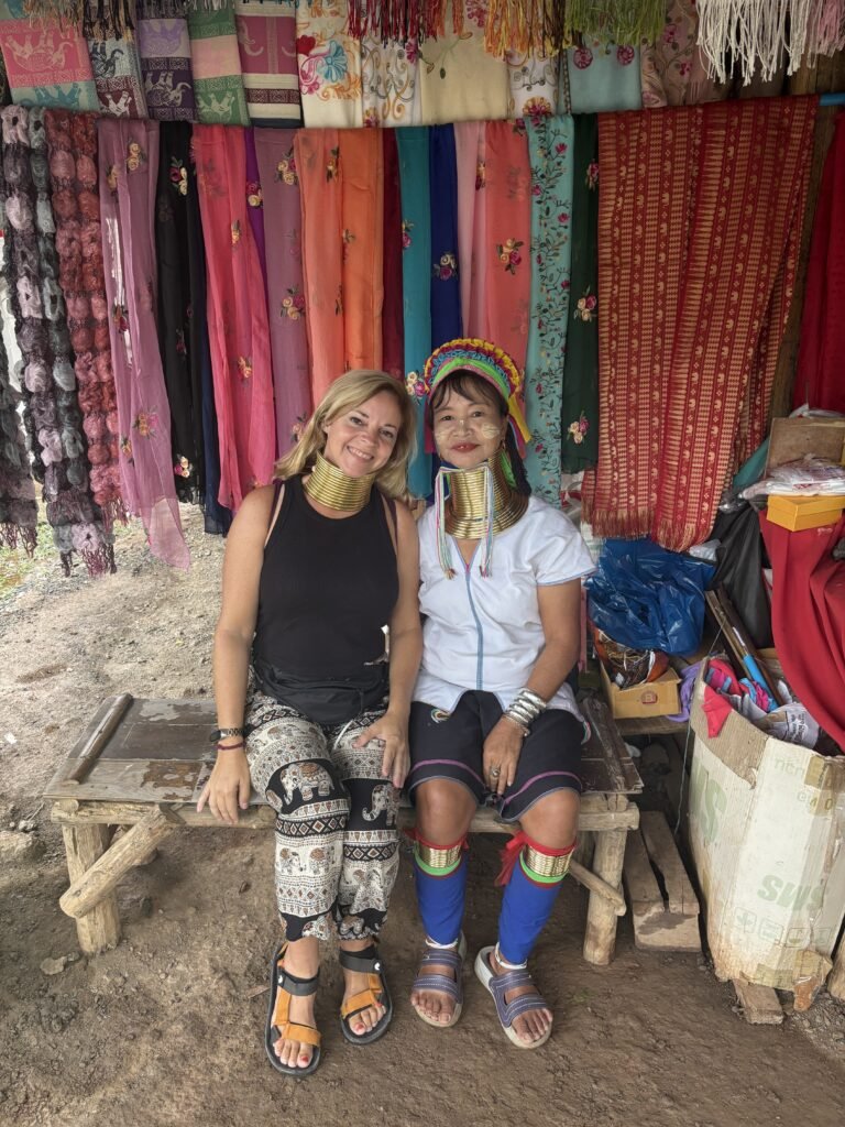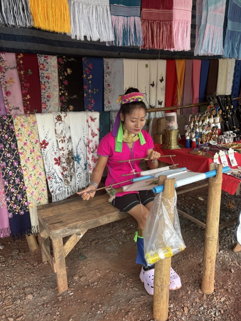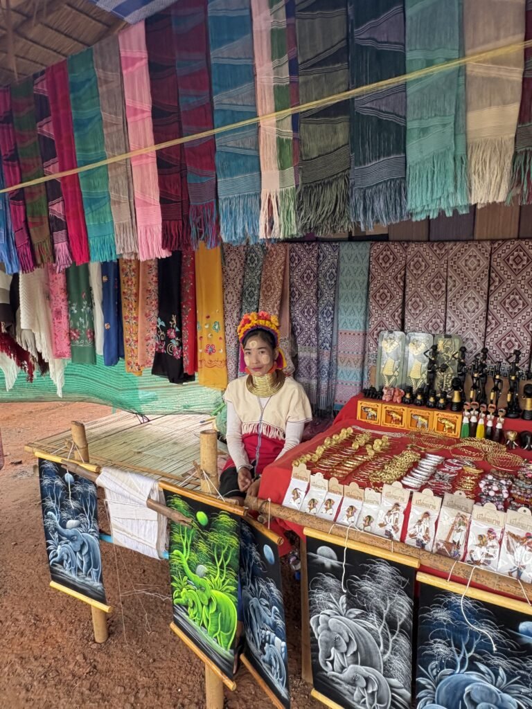 Las mujeres Kayan son originarias de Myanmar (Birmania). Hace décadas tuvieron que huir de su país por los conflictos internos y buscar refugio en el norte de Tailandia. Allí formaron pequeñas aldeas donde hoy viven del arte que crean con sus manos: tejidos, bufandas, mantas, pulseras y souvenirs hechos con una paciencia y un detalle que te deja hipnotizada.