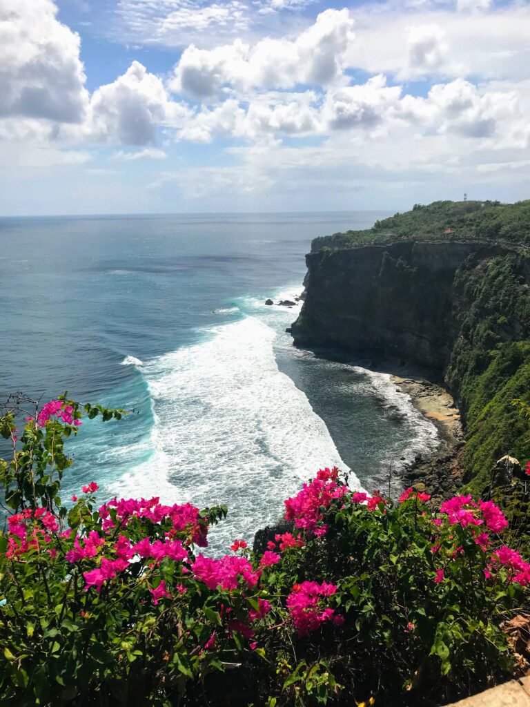 Y de repente estás ahí: frente a ese paisaje tremendo de flores fucsias, acantilado infinito y un templo sagrado colgado del borde del mundo. Literal. Lo que ves en la primera foto.