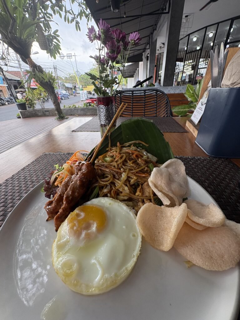 Al final, me refugié en un café/restaurante y terminé almorzando un plato típico balinés: un Mie Goreng (fideos fritos salteados con pollo y verduras), con un huevo frito perfecto arriba, satay de pollo con salsa de maní, ensaladita fresca y krupuk (esas galletitas crocantes que parecen papitas mágicas). ¡Un manjar! Nada mejor para reconciliarse con el día después del aguacero.