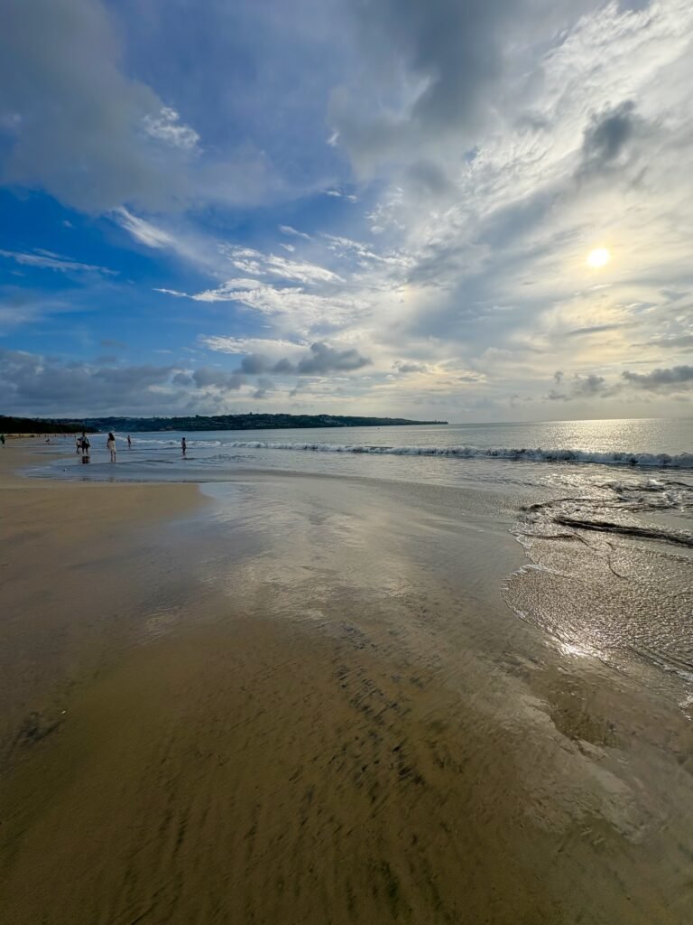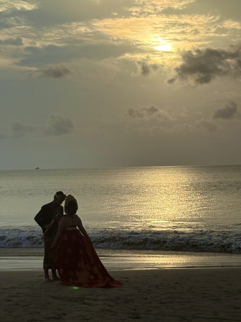 Y como la vida siempre da revancha, al rato paró de llover. Así que me fui igual a la playa de Jimbaran, me tiré a tomar sol como lagartija feliz y hasta tuve espectáculo de película: unos recién casados sacándose fotos en pleno atardecer. Una hermosura ver esa escena romántica con el mar de fondo, mientras yo pensaba: “¡Mirá vos, Jimbaran! de chaparrón a postal de boda en un par de horas”.