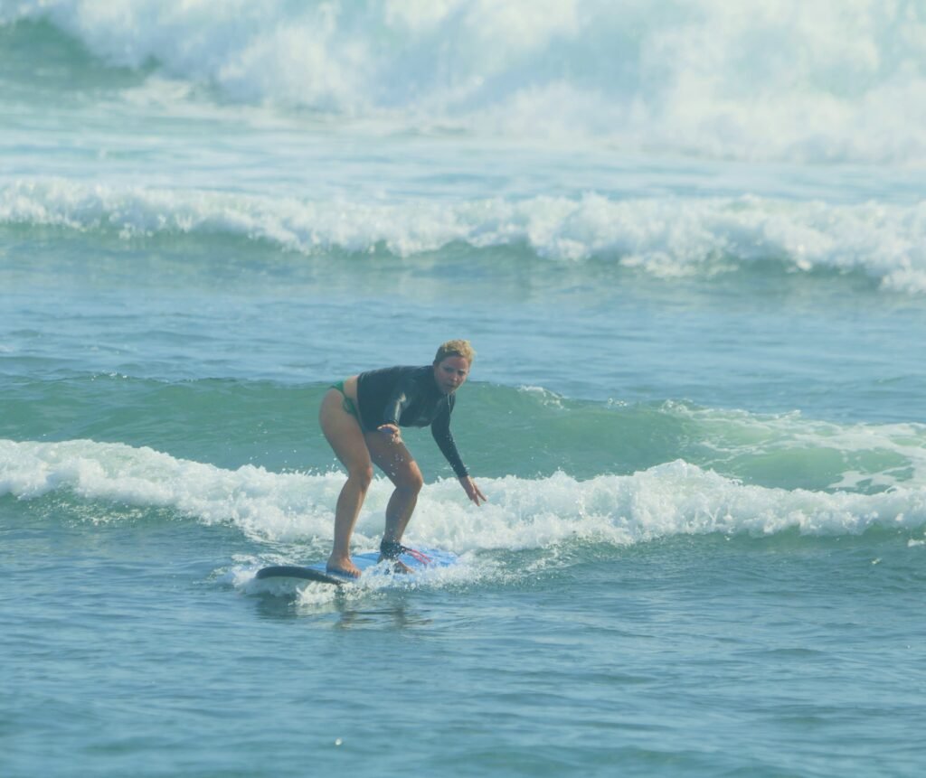 Segunda ola: ahí vino la redención. El profe me empuja la tabla, me grita “stand up!”, y yo pienso “sí, claro, querido, si apenas puedo pararme en tierra firme”. Pero algo se alineó en el universo: me levanté. No sé si fue equilibrio o puro milagro, pero estuve de pie.