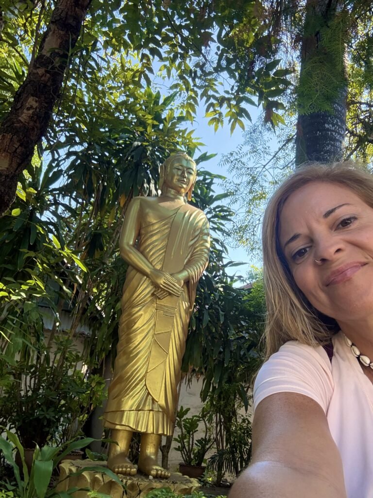 Hoy entré a Wat Ahan pensando que iba a ver un templito tranquilo, de esos que saludás, das una vueltita y te vas. Pero no. Apenas cruzo la puerta y siento que me metí en un episodio perdido de la vida del Buda, versión ilustrada para que nadie se duerma. Las paredes están cubiertas de murales que mezclan mandalas, cómic, novela espiritual y un toque de delirio artístico hermoso. Es como si alguien hubiera dicho: “explíquenme toda la iluminación del Buda, pero háganlo tan colorido que el cerebro tenga que actualizarse”.