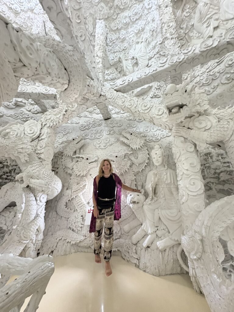 Apenas entré, quedé envuelta en un blanco tan intenso que parecía que me habían metido en el lavarropas en modo “extra blanqueador”. Yo, con mis pantalones estampados, era la única señal humana de color en todo ese paisaje. En un momento pensé: “si me quedo quieta dos minutos, estos budas me absorben y salgo de acá convertida en decoración”.